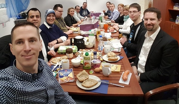(Auf dem Foto v.l.n.r.: Steffan, Ali, Ayse, Fabian, Cindy, Wassili, Stefan | Thomas, Malte, Franziska, Gisela, Tobias, Andreas)