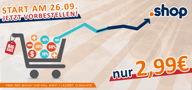 Es ist nicht mehr lange hin. Am 26.09.2016 wird die rekordverdächtige und jetzt schon sehr beliebte Domain-Endung .shop für alle zur Registrierung verfügbar. Verpassen Sie nicht die Vorbestellung zum Go-Live.