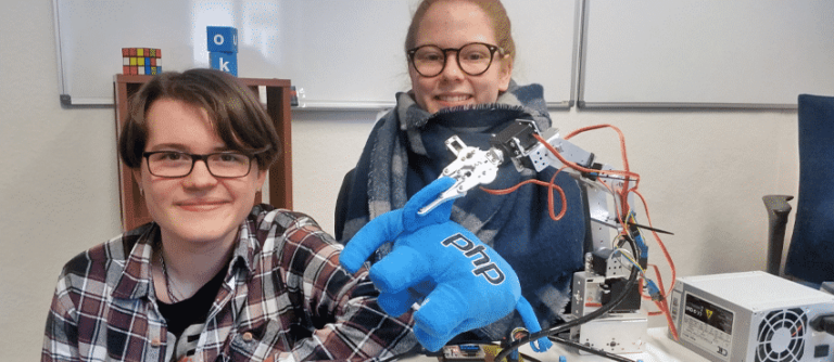 Anna hat zudem auch Beispielprogramme geschrieben, mit denen man den Roboterarm direkt etwas aufheben und wieder ablegen lassen kann. Als Testobjekt musste hierfür oft der blaue PHP-Plüschelefant aus dem Büro herhalten. Er hat jetzt wahrscheinlich eine Gehirnerschütterung von all den holprigen Testläufen, aber dafür funktioniert die Software nun reibungslos. Danke, PHPfant!