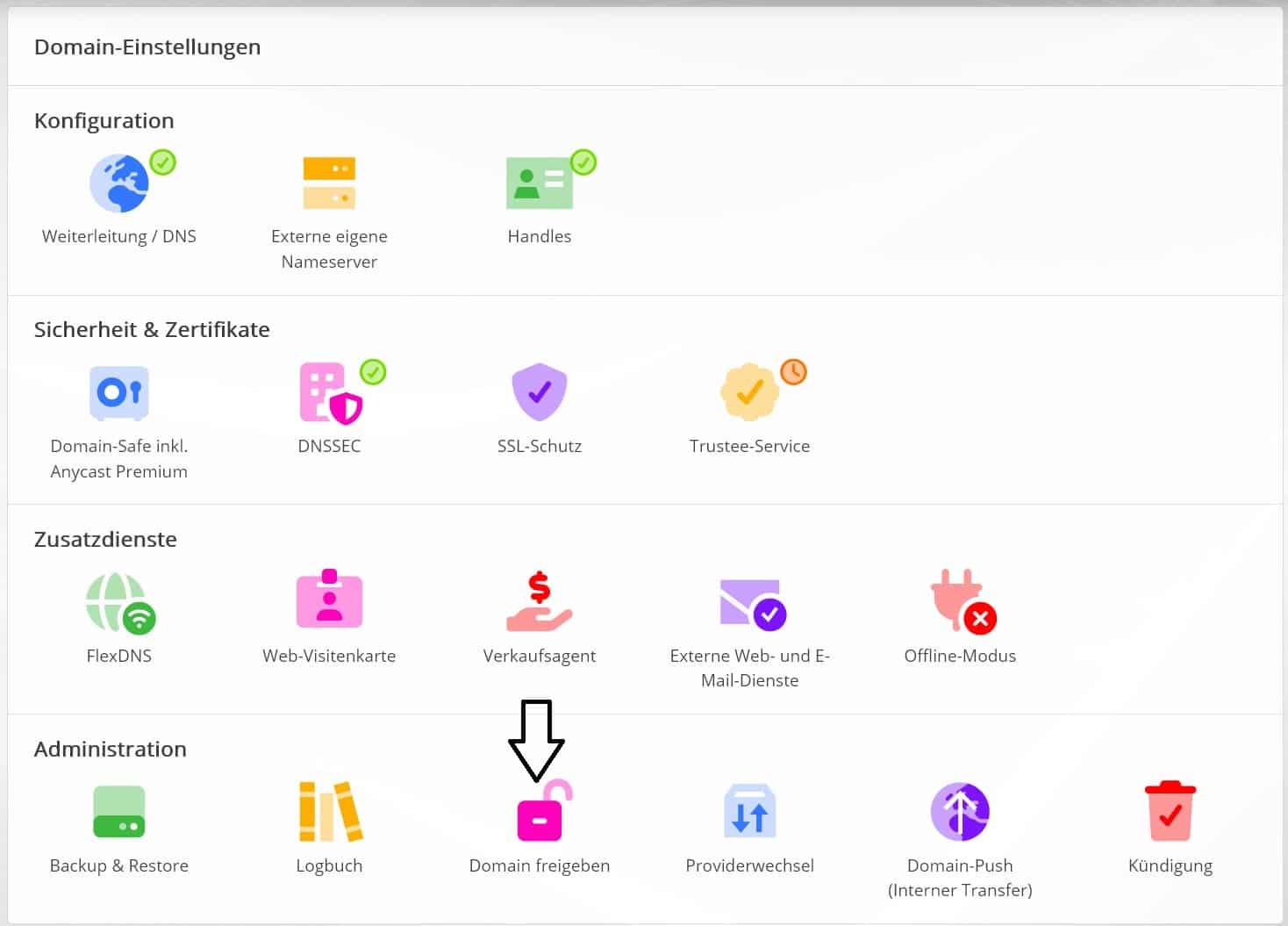 Hinweis: Im Fall, dass Du unseren Domain-Safe nutzt, ist das Icon der Domain-Freigabe mit einem Schloss-Symbol versehen und die Funktion blockiert.