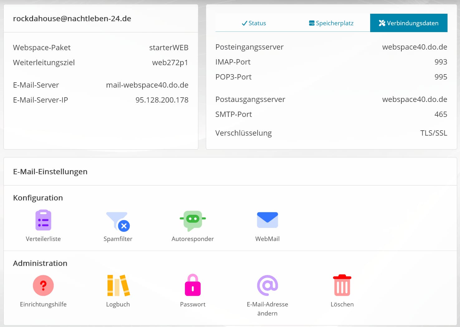 Die Daten zu dem E-Mail-Postfach werden direkt nach dem Anlegen einer E-Mail-Adresse angezeigt.