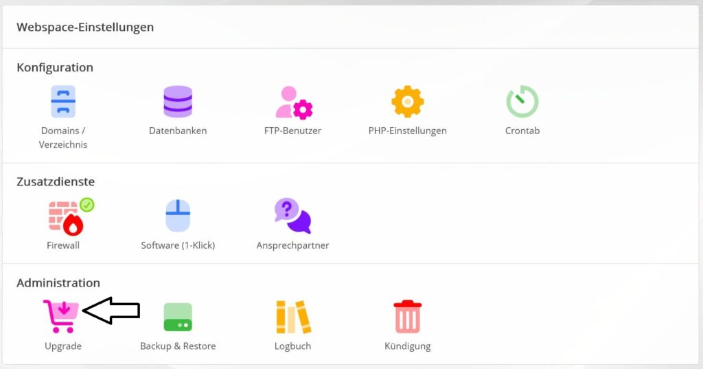Diese Möglichkeit findet man links in der Navigation, mit Klick auf Webspace und dort unter den Webspace-Einstellungen unter „Upgrade“.